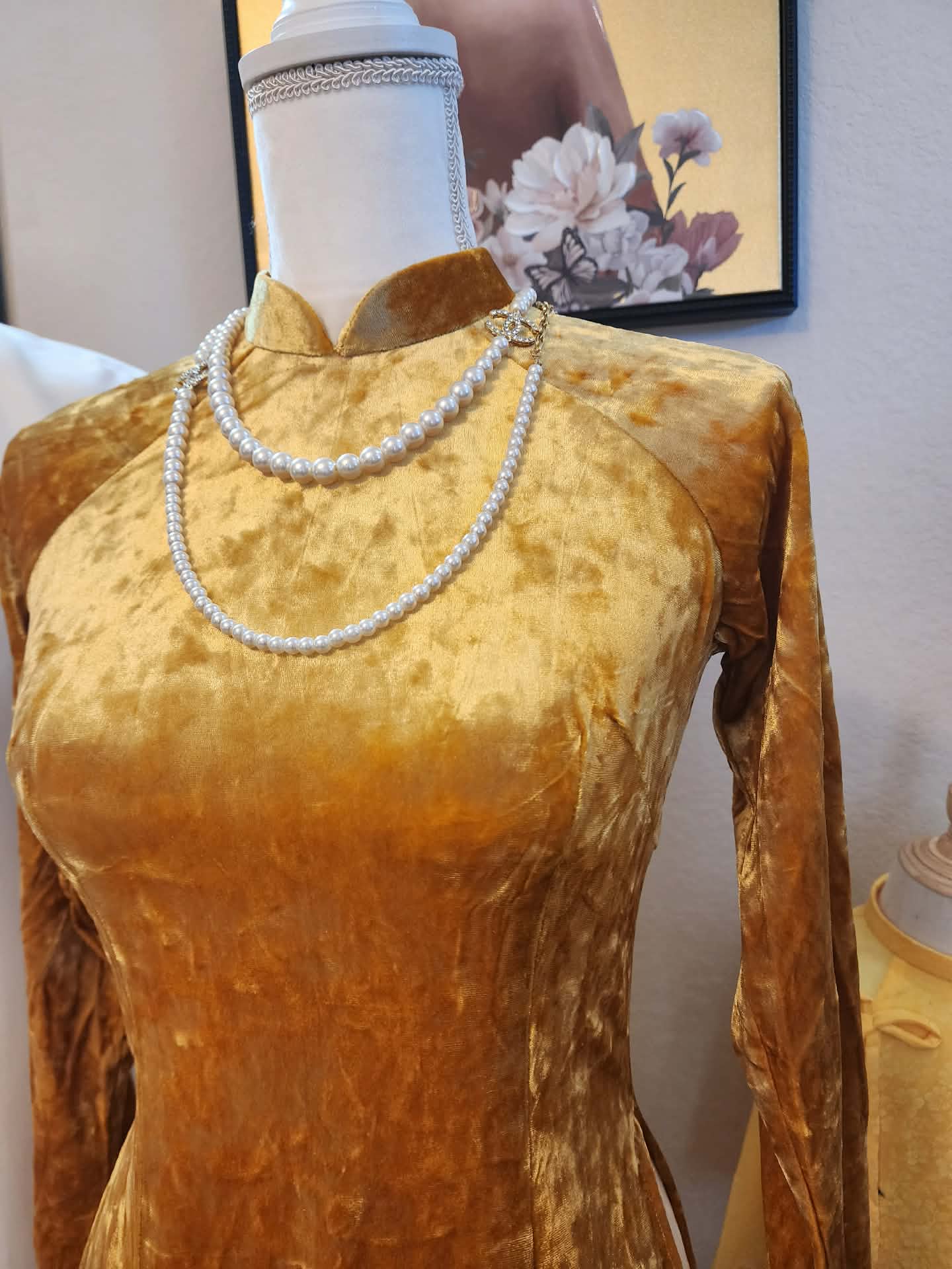 Ao Dai Nhung- Velet: Vietnamese Traditional Long Dress / Yellow Color/ No pants/ TT89