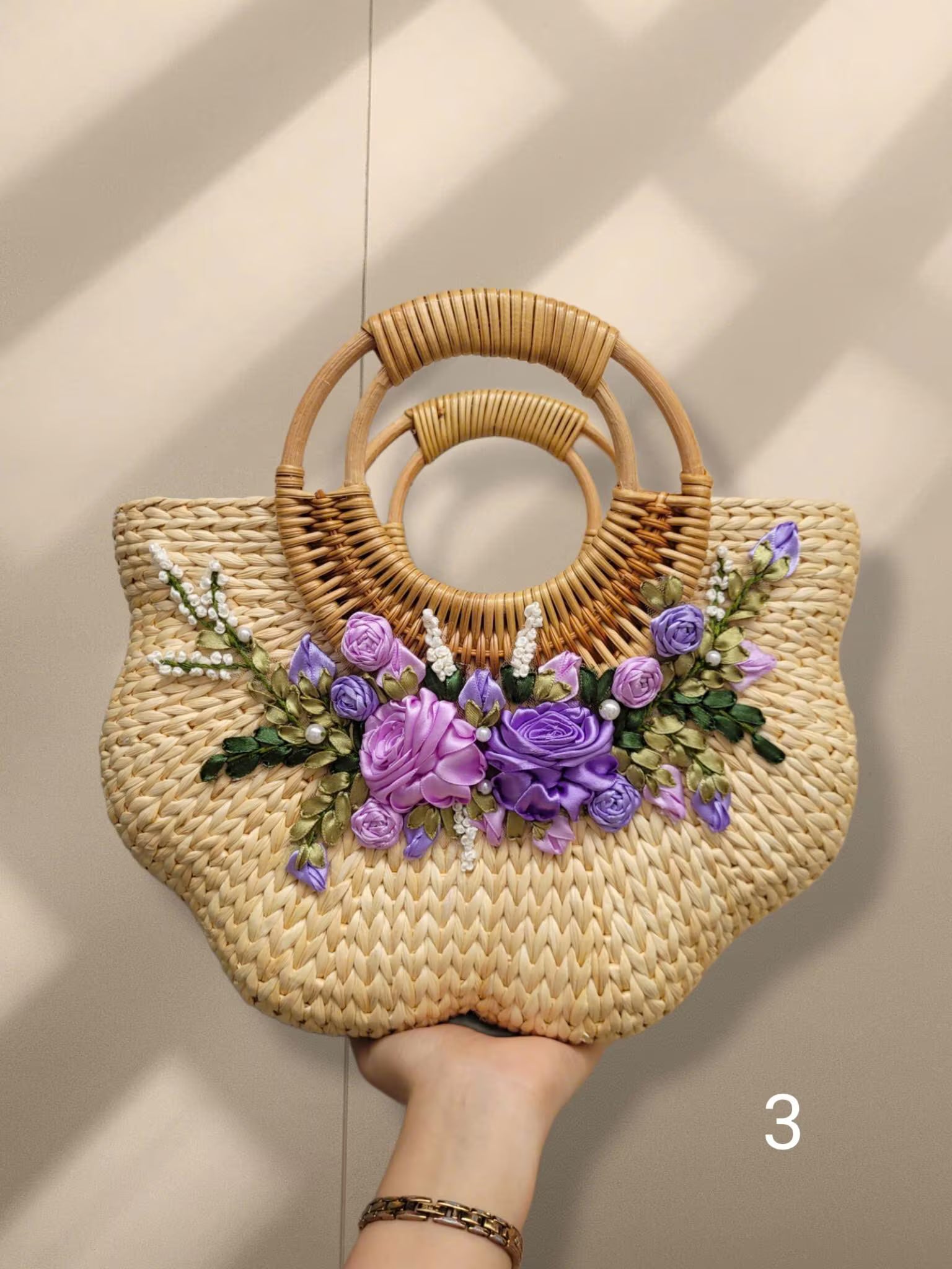 Step into timeless elegance with this handcrafted rattan handbag, adorned with luxurious 3D ribbon-embroidered florals. Each bloom is meticulously stitched by hand, creating a captivating, dimensional artwork that feels both romantic and refined.