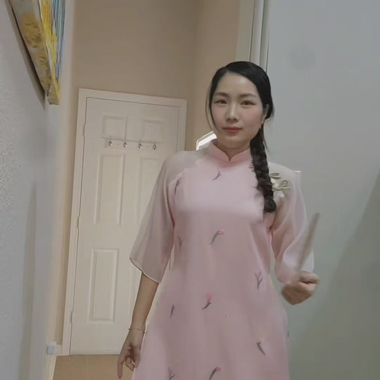 Pink Ao Dai Cach Tan: Vietnamese Modernized Long Dress with Cream Pants/ CT283