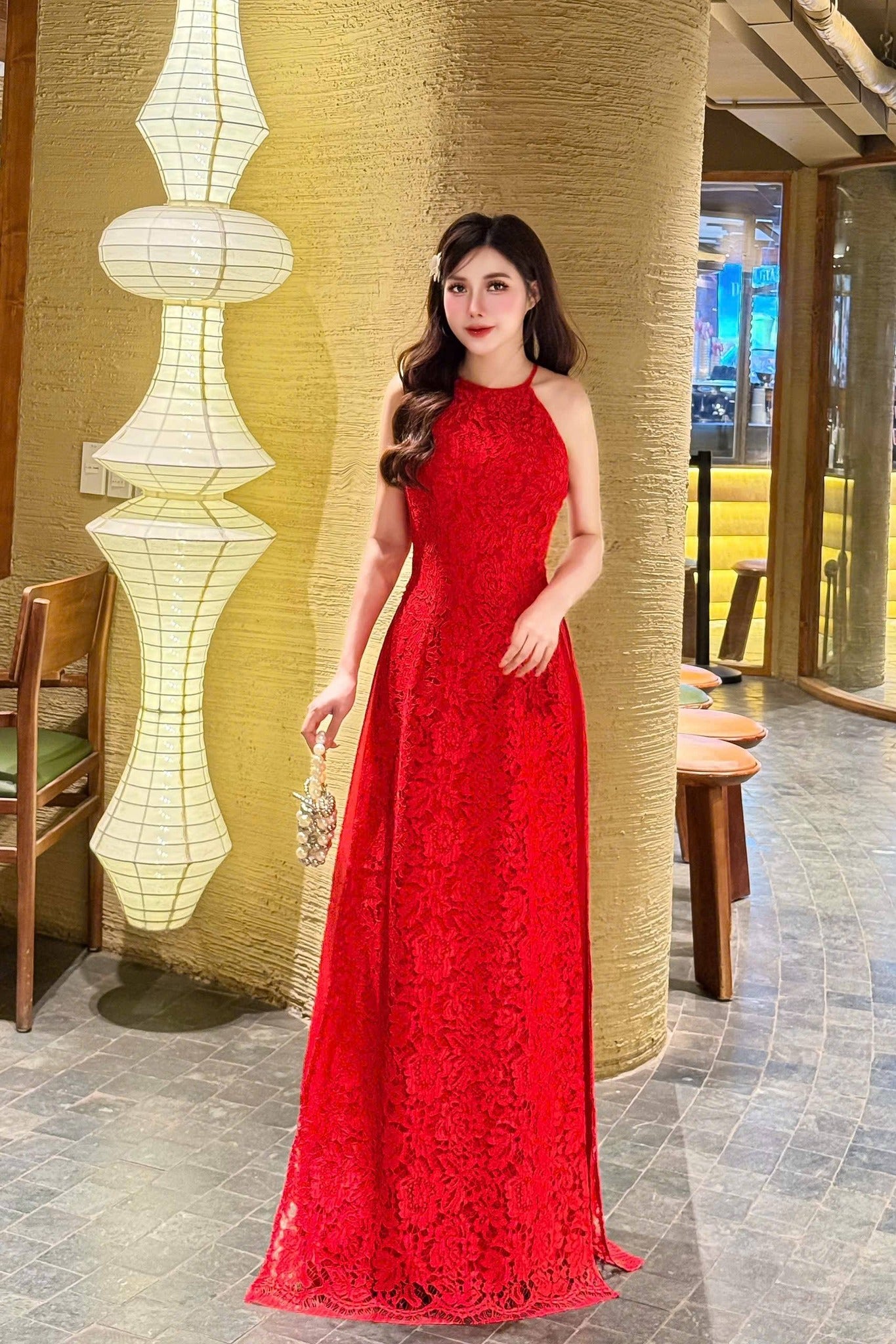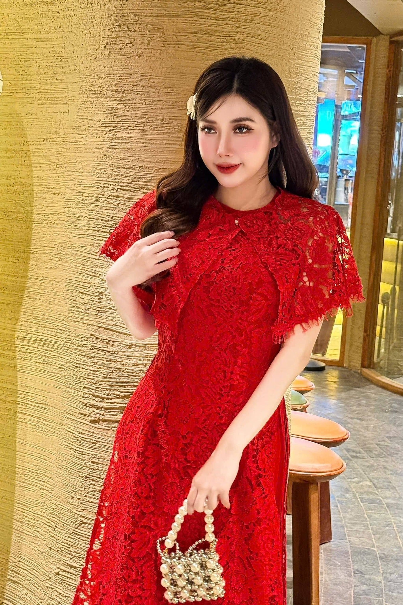 Set Ao Dai Ren Cao Cap/ Set includes a shoulder overlay that can be styled in three different ways with Red Pants/B254