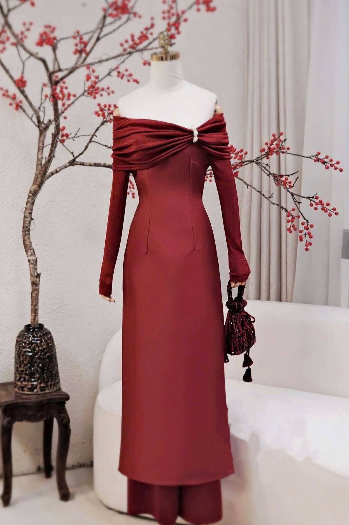 Set Taffeta Áo Dài with Silk-Blend Sleeves Burgundy Color/Set Ao Dai Design for Women/B291