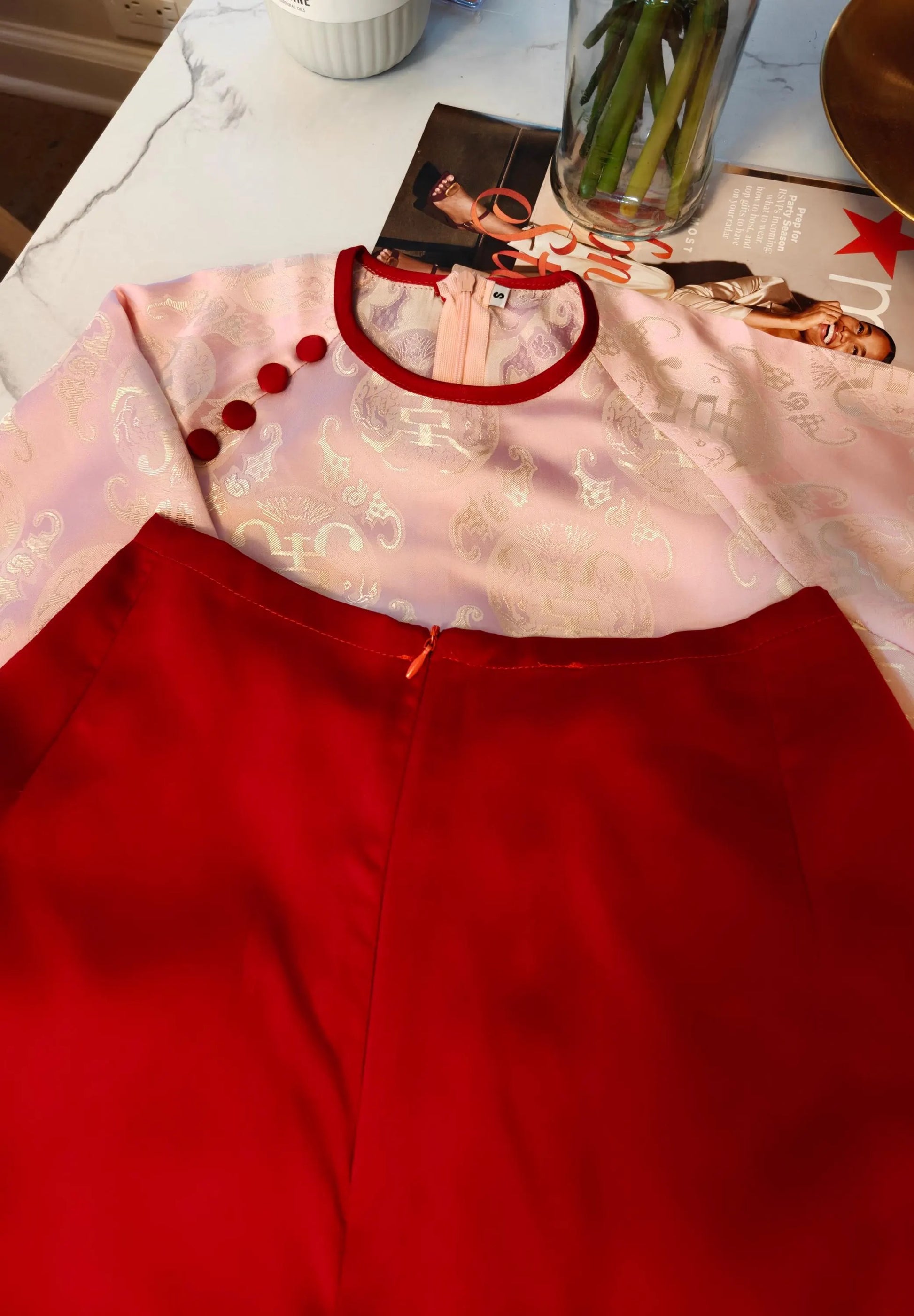 ❣️ This elegant silk Áo Dài set is crafted from the same premium woven silk fabric, featuring a subtle Dragon & Phoenix (Long Phụng) motif that represents love, harmony, and prosperity in Vietnamese culture. The top comes in a soft blush pink with a warm golden undertone, creating a gentle, luminous look that flatters many skin tones. The fabric feels smooth and lightweight with a natural sheen that adds quiet luxury.